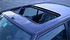 BXのセダン(一部キャブ車を除く)には、チルト&スライドが可能なガラス製サンルーフが付いています(Webasto-Heuliez製)。このサンルーフですが、Bピラーを越えた後ろの方にまで開口部があるという、セダン系では5本の指に入ると思われる大きさを誇っています。戸袋を持つインナー・スライディング型では最大かもしれません。ルーフに開いた穴は55*88cm、そのうち実際に車内から見た開口部の大きさは42*83cmという大きさです。