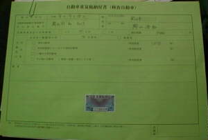 右上の写真は重量税の納付書です。下に貼ってあるのが重量税の印紙ですね。印紙を買うときには車検証で自分の車の重量がいくらかをちゃんと調べてからにしましょう(前回払った額は車検証に書いてあります)。